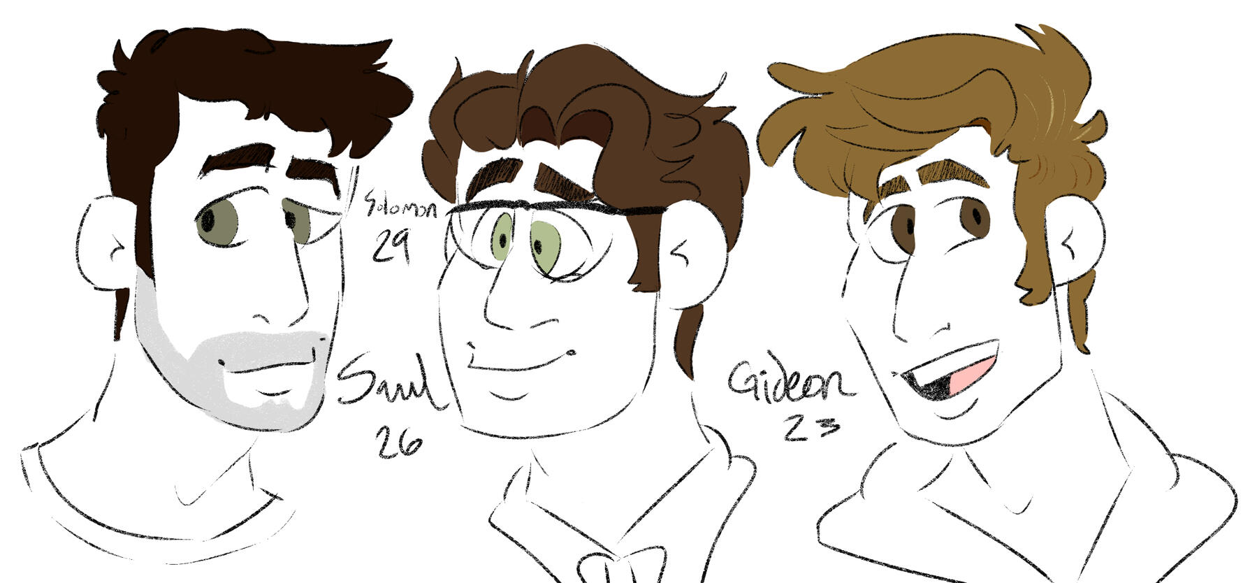 the weaver brothers were born into a evangelical christian cult based on a home church framework on the eastern edge of ohio. the boys were homeschooled by their mother, and their father worked odd jobs to make ends meet. they were raised on deeply conservative views, and their community was limited to the other children and families in their church group.solomon as the oldest has always faced the brunt of the abuse offered by the community, spending his youth trying to defend and protect his siblings. he has never quite fit in, and has a way of accidentally getting into situations he is punished for. playing instruments was always his escape from his world, and he used it as a way to worship god. he has always been a quiet and well behaved boy, and it is not enough. at 17, immediately after graduating high school, solomon fled to new york, where he currently lives and works as a music tutor. he shares a one bedroom with a high school band teacher, stephen, who he does not have a crush on. he does not speak to his parents, and they do not know he is gay, especially because he has never allowed himself to be. with his baby brother recently moving in, he and stephen have agreed to share a bedroom to give gideon the couch to sleep on and the semblance of privacy.saul is the middle child, but he is clearly the favorite. growing up, he was popular, outgoing, and athletic. he frequently broke rules, and he was somehow never caught. he knew many outsiders to their community and is the one who encouraged solomon to leave, knowing how much he was struggling at home. it broke his parents heart when he announced he was moving to pittsburgh with some friends, but they of course forgive him and allow him to visit. he is the sole line of communication between solomon and their parents. he is scraping together funds to hopefully attend college and study social work.gideon is the baby, and was unplanned and resented by their mother until he took a sincere interest in religion. as a result, she was more neglectful with him than anything, and he ended up raised largely by solomon and saul, who love him very dearly. he lived at home until he was 19, studying religion, performing sermons, and hoping to be made a church leader. near the time he was hoping to be announced, he got caught up with another boy from their church and they were caught kissing on the weaver property by his mother. irate and disgusted, she immediately kicked him out without even letting him pack a bag, and he called his brothers for help. after spending a week with saul in pittsburgh sleeping on the floor, he chose to bus to new york to live with solomon and his roommate, where he will at least have a couch to crash on.